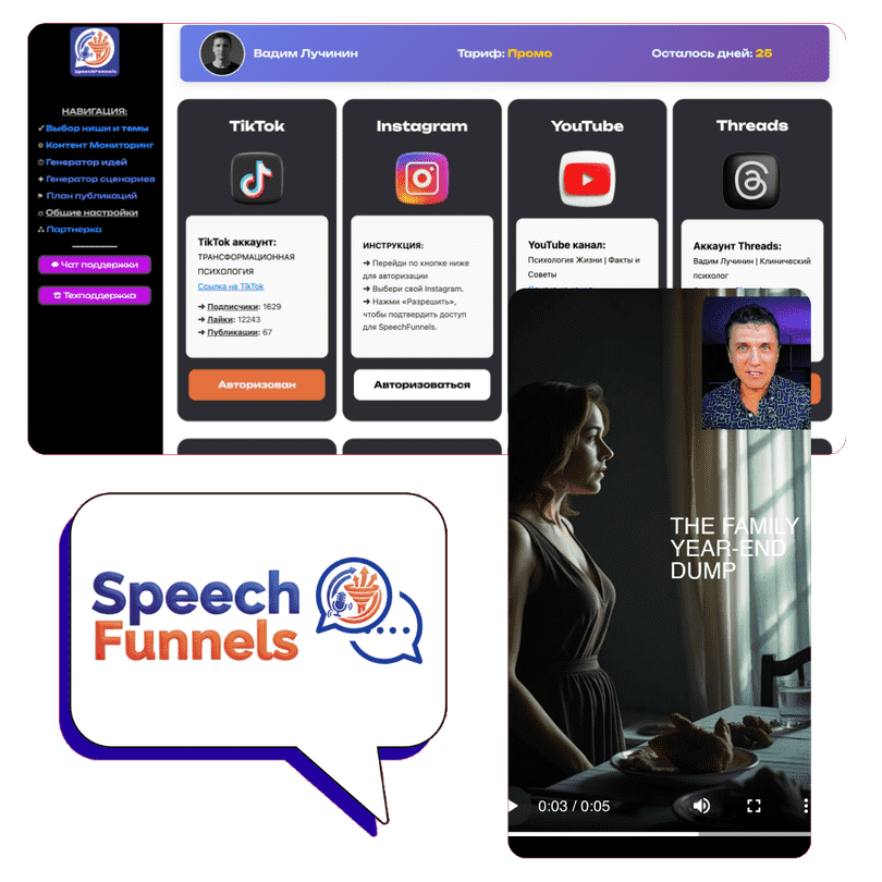 ✔ Automatic posting on social networks from one window (Instagram, YouTube, Threads, TikTok)